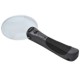 Loupe ergonomique grossissement x 2,5 avec manche bi-matière plastique et caoutchouc. Double diode LED blanche. Fonctionne avec 3 piles bouton LR54 fournies. Diamètre de la loupe : 9 cm.